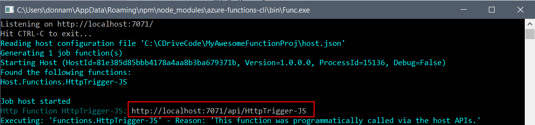 terminal You’ll see that a separate window launches, which is the Functions host. By default, it will listen on http://localhost:7071. In the Functions host window, you’ll see that the URL of HTTP triggers is listed. You can then use a web debugging tool like Fiddler or Postman to create more complex requests. 4