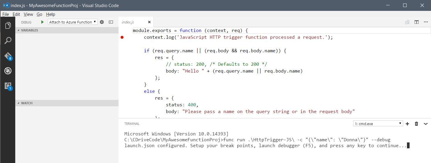 If you prefer VS Code or want to debug JavaScript functions, you can use the Azure Functions CLI. Note that currently the Azure Functions CLI only works on Windows, but we’re working on support for other platforms. (Note that C# debugging support is currently only available in Visual Studio, not VS Code.)