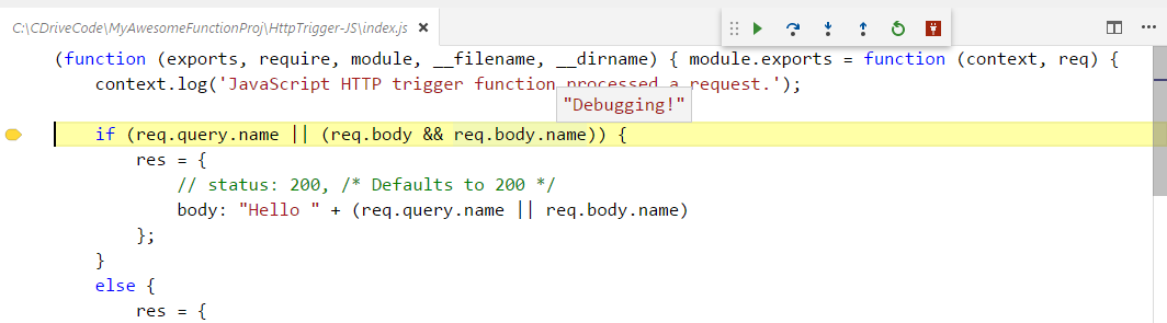 Running a function is great, but debugging is where the magic happens. To run the code and attach the JavaScript debugger, do the following: