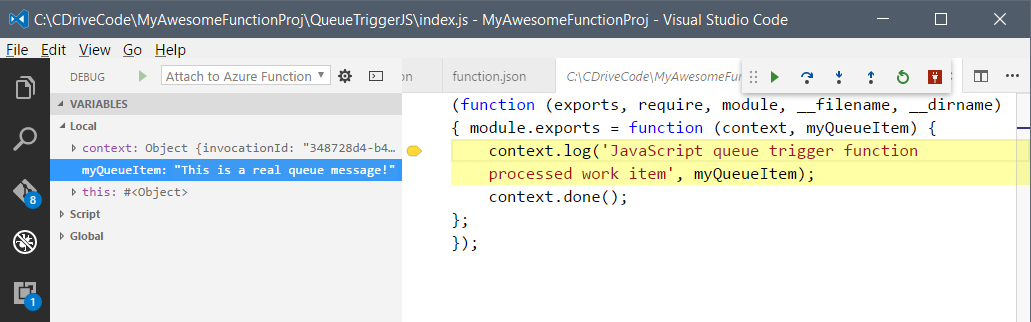 Launch Azure Storage Explorer and create a queue js-queue-items in storage account you’ve specified in the AzureWebJobsStorage connection string: 7 8 Then, in Visual Studio Code, we see out breakpoint being hit: 9 This is just a taste of what you can accomplish with the Azure Functions CLI. Try it out today and let us know what you think!