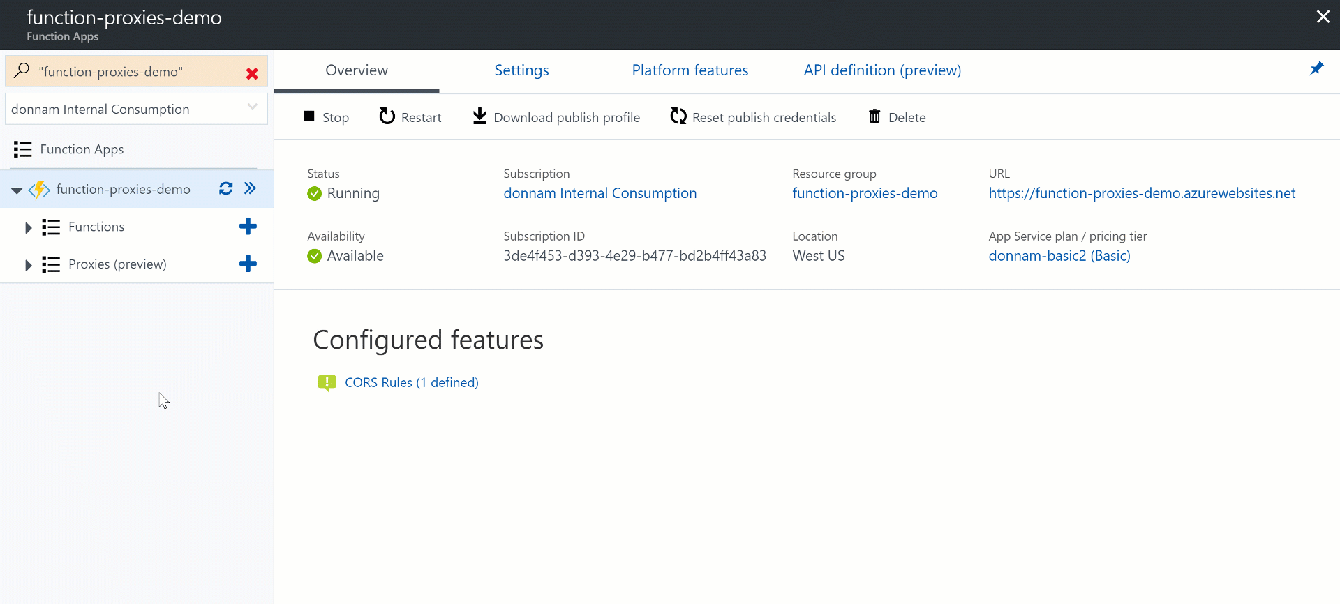 Once you’ve selected a Function App, the Overview tab on the right displays information about your app and is similar to the App Service resource blade. From here, you can stop, restart and delete your app, download the publish profile, and reset publish credentials. The Configured features section lists any platform features that you’ve customized. For instance, if you have configured a deployment option, you can navigate to the settings directly from the overview page. configured-features The Settings tab includes Function App level settings, such as the runtime version, proxies configuration, and host keys. The Platform features tab lists all relevant App Service settings. If you miss the App Service resource blade, you can still get to it from General Settings -> All settings. Features that are not available for your app are still displayed, but include a tooltip on why they are not available. You can also search settings based on either exact name or a descriptive tag. For instance, searching on “git” will highlight the option Deployment source. search-platform-features The API definition tab allows you to configure a Swagger API definition. For more information on the feature, see the blog post Announcing Azure Functions OpenAPI (Swagger) support preview.