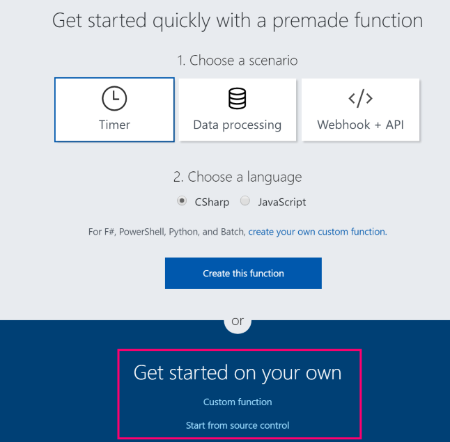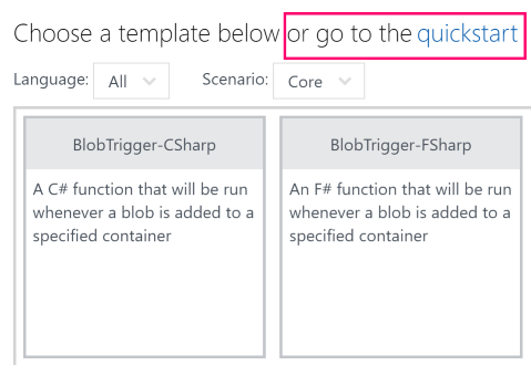 The New Function page has a few changes. Since the main Function App page now shows the Overview tab, that displaced the Quickstart experience. We’ve incorporated it as part of the New Function page. If a Function App has no functions, you’ll see the quickstart below. To get to the full template view, select Create custom function at the bottom of the page. To get to the quickstart view below from the template view, select “go to the quickstart.” quickstart-page template-page