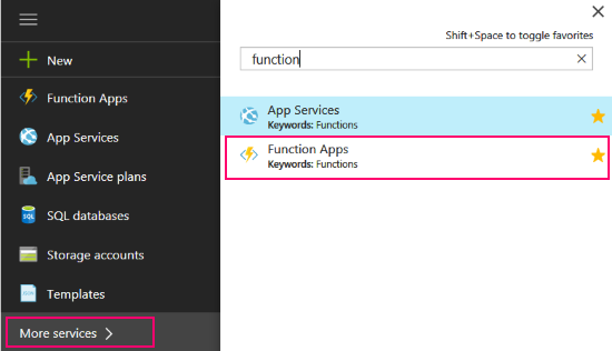 There is now a new browse blade for Function Apps that you can pin to the left-hand service menu. Under More services, search for Functions. service-menu Once you’re on the browse blade, you’ll see all Function Apps in your active subscription in a tree view on the left. You can filter on one or more subscriptions or search for an app name. In the list view on the right, apps are listed in a grid view that includes the subscription, resource group, and location. If you select an app in the grid view, you’ll see a scoped view for just that Function App. Clearing the search box at the top will show all Function Apps in the selected subscriptions. See animated gif below. function-navigation-filter-and-scope You can also scope to a particular Function App by selecting the chevron to the right of the app name. The refresh button will update the function and proxies list. On a Consumption plan, the refresh button also synchronizes triggers with the central listener. (This is required if you FTP or Kudu to modify your function.json files.)