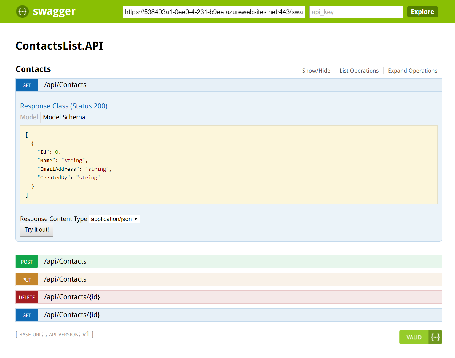 2. API Contacts List:  A combination single page application and backend API. Experiment with adding and removing contacts from your list, and then use the Swagger doc to experiment with the underlying API calls.contactslistwebpageSwagger UI showing the underlying API in the contacts list API contactslistswagger