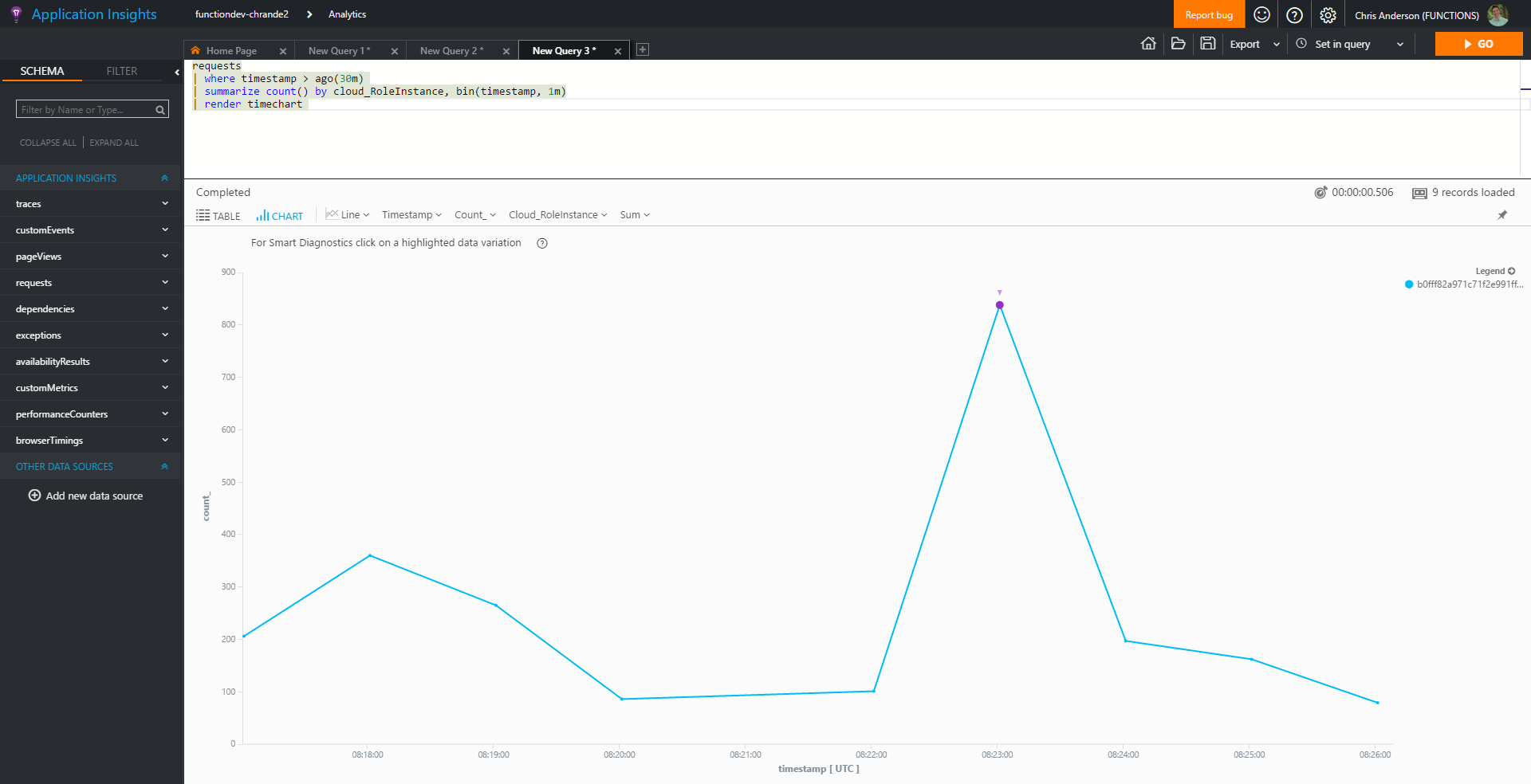 The analytics portal provides you the ability to write custom queries against your data. This is one of the most powerful tools in your tool box. Currently, the following tables are full of data from the Functions runtime: