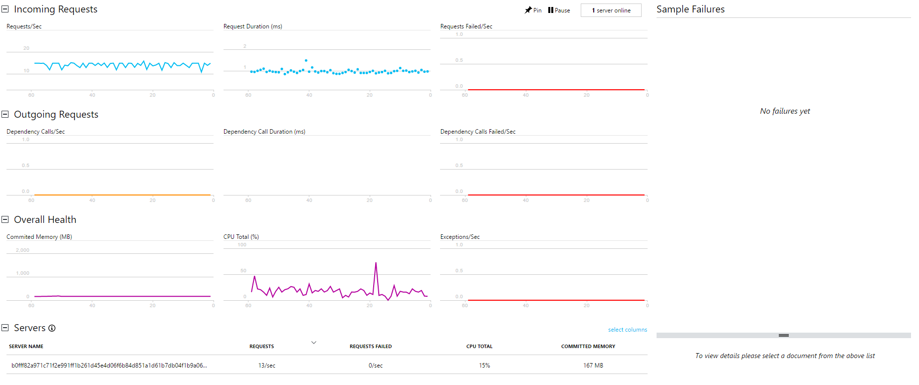 If you open your Application Insights resource in the portal, you should see the option for “Live Metrics Stream” in the menu. Click on it and you’ll see a near-live view of what’s coming from your Function App. For executions, it has info on #/second, average duration, and failures/second. It also has information on resource consumption. You can pivot all of these by the “instance” your functions are on; providing you insight on whether a specific instance might be having an issue or all of your Functions. Known issues: there are no dependencies being tracked right now, so the middle section is mostly useless for now. If you send your own custom dependencies, it’s not likely to show up here since they won’t be going through the Live Stream API since you’re normally using a different client, today. livestream
