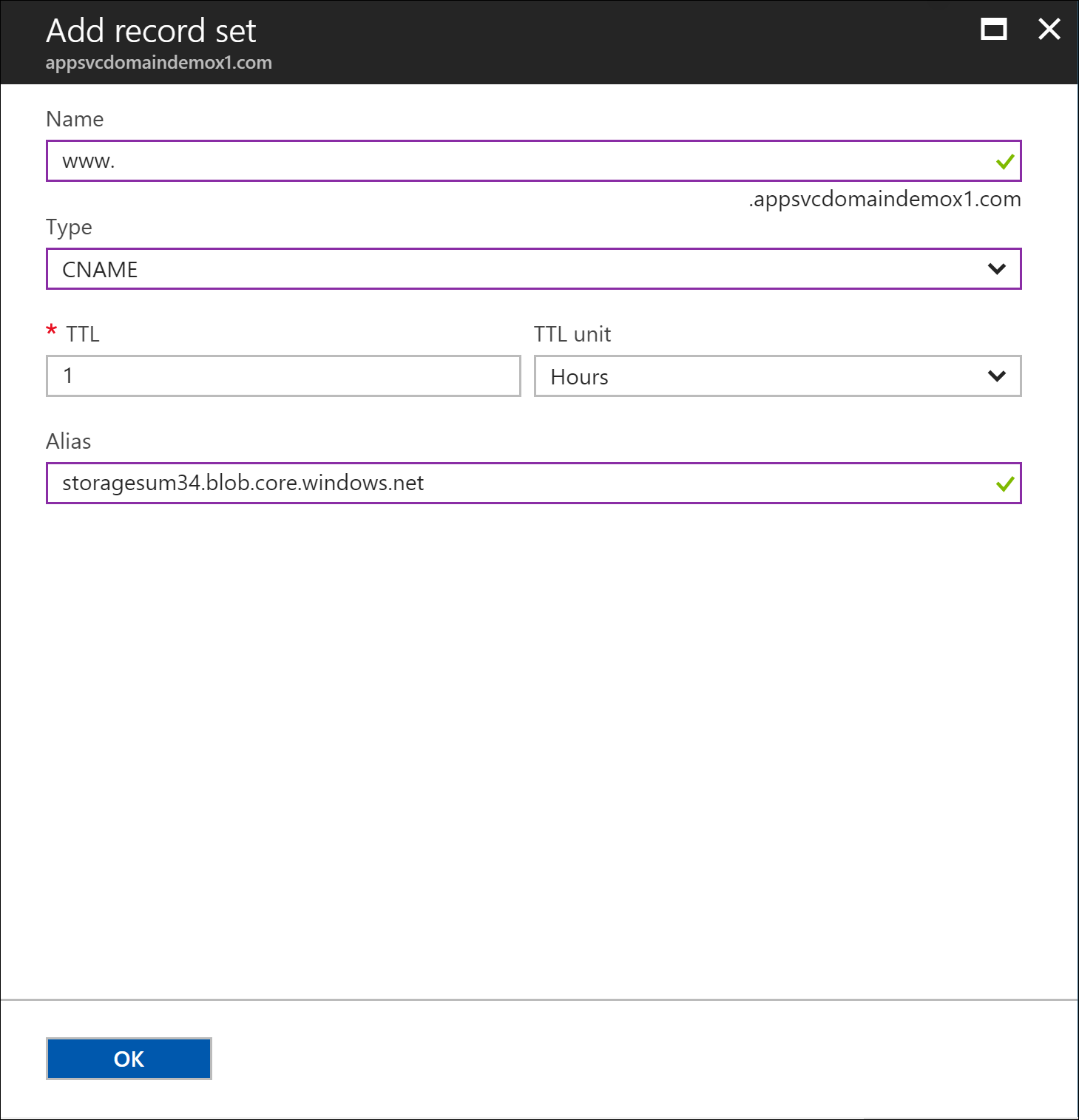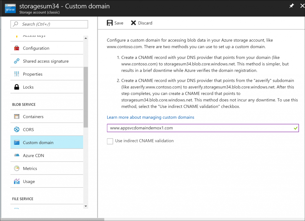 Create an App Service Domain . Once provisioned , select DNS Zone setting and Add a record set . Create a new CNAME record and provide a subdomain alias such as www or images. Then provide a host name, which is your Blob service endpoint, in the format my-storage-account-name.blob.core.windows.net (where my-storage-account-name is the name of your storage account). Go to your storage resource in the Azure portal and select Custom Domain setting. In the text box on the Custom domain blade in the Azure portal, enter the name of your custom domain, including the subdomain. For example, if your domain is example.com and your subdomain alias is www, enter www.example.com. If your subdomain is images, enter images.contoso.com. The subdomain is required. Click on Save. Access your files on Azure storage using the custom domain.