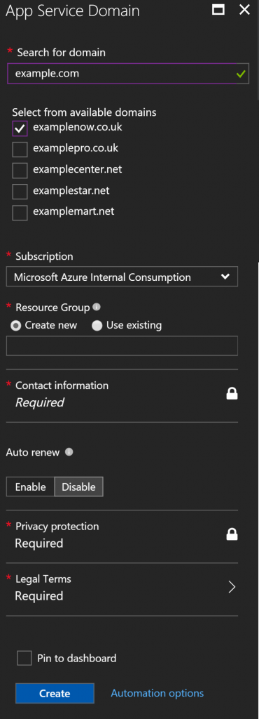 Click the Contact Information and fill out the domain's contact information form. When finished, click OK to return to the App Service Domain page. Next, select the desired options for your domain. See the following table for explanations: