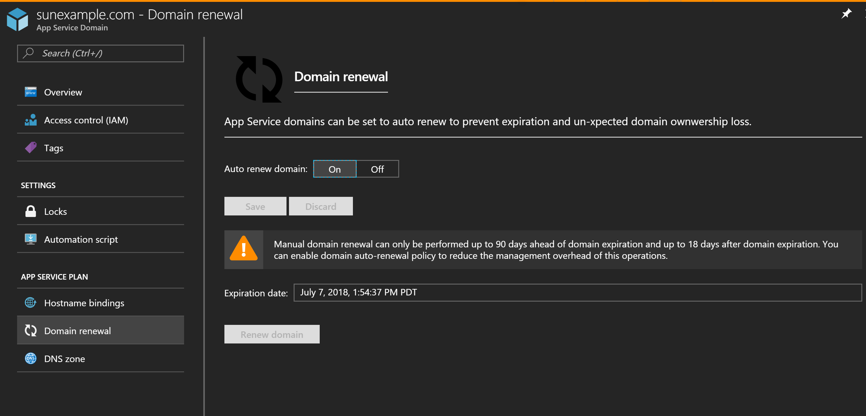 Auto renew Enable Renews your App Service Domain automatically every year. Your credit card is charged the same purchase price at the time of renewal.