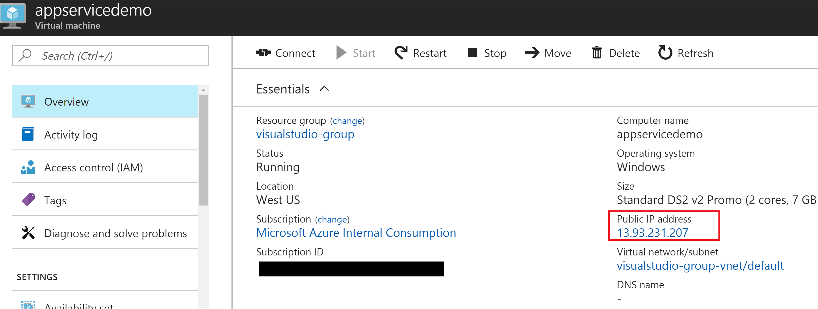 Resource Manager VMs can have a Public IP. A VM with a Public IP address may also be behind a load balancer. You can create a DNS A or CNAME record for the Public address. This custom name can be used to bypass the VIP on the load balancer. To verify if you VM has a public IP , go the resource group used by the VM to see if you have a resource "Public IP address" . You can get the IP address by selecting the Public IP address resource or select your Virtual machine to get the IP address Select your domain and choose DNS Zone setting Click on Add a Record Set . Add an A record for your Public IP  configured to a subdomain alias such as www or blog  as shown below. Configure your TTL setting on when your domain should resolve to the new domain hosting service.