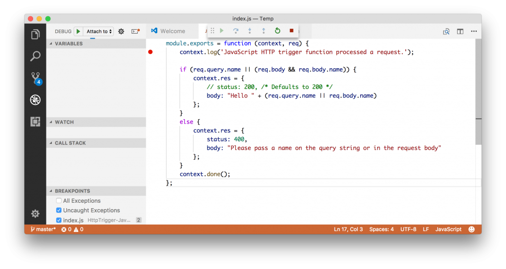 http://localhost:7071/api/HttpTriggerCSharp?name=CSharpEverywhere!. You’ll then see your breakpoint hit in VSCode.