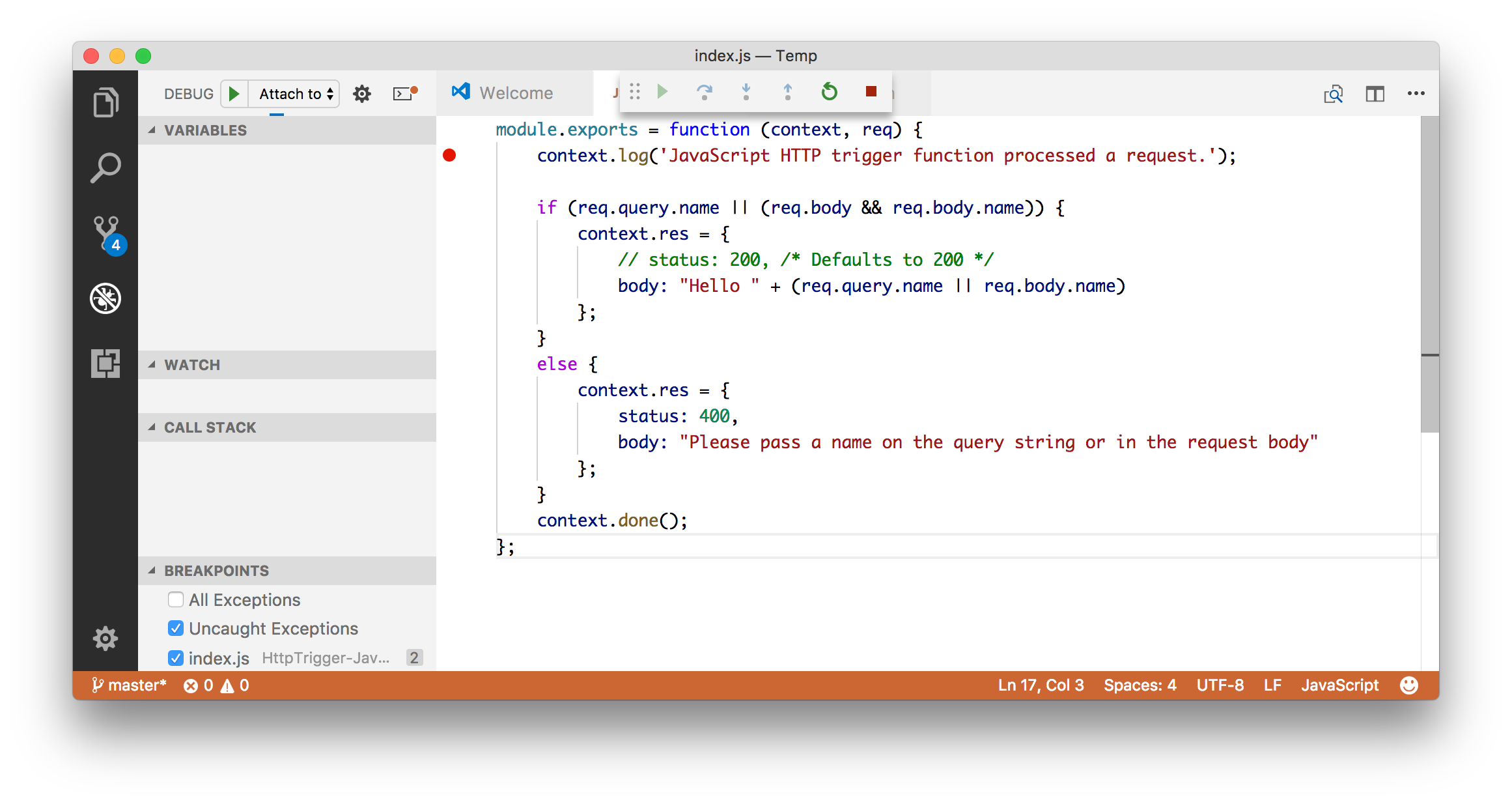 I’m excited to announce that we have ported Azure Functions to .NET Core 2.0! Both the runtime and the Azure Functions Core Tools are now cross-platform. Now, you can debug C# and JavaScript functions on a Mac or Linux using the Core Tools and Visual Studio Code. Both the runtime and the Core Tools are still in preview and we welcome your feedback!