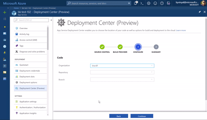 We are happy to announce a new preview experience for setting up deployments to Azure App Service.