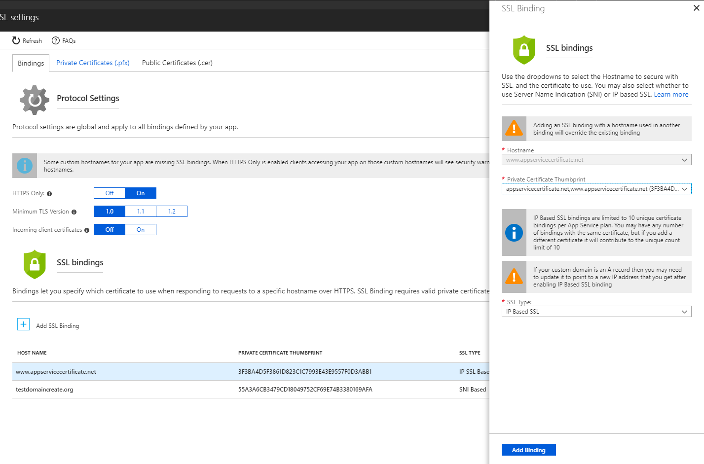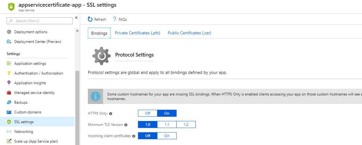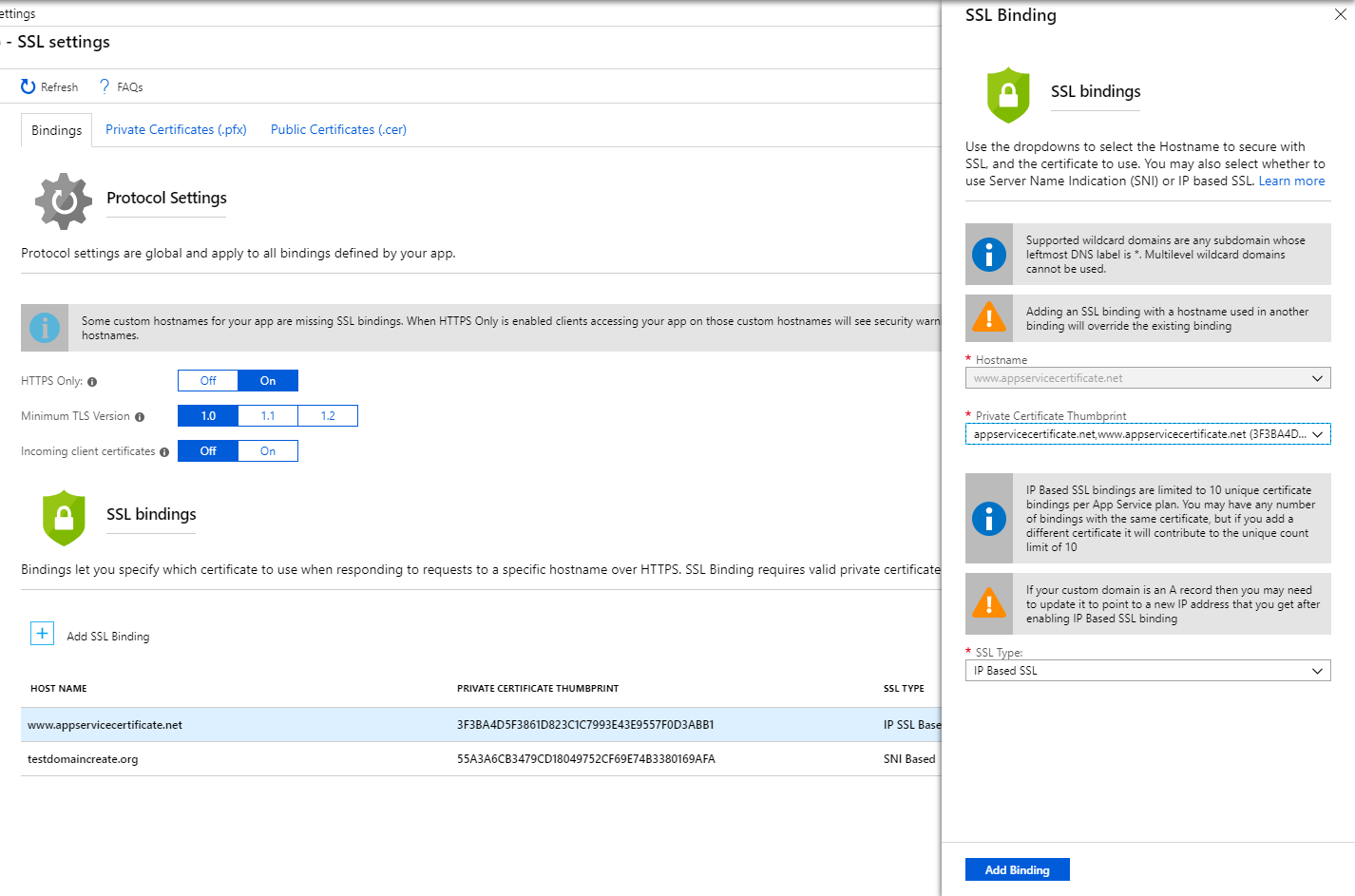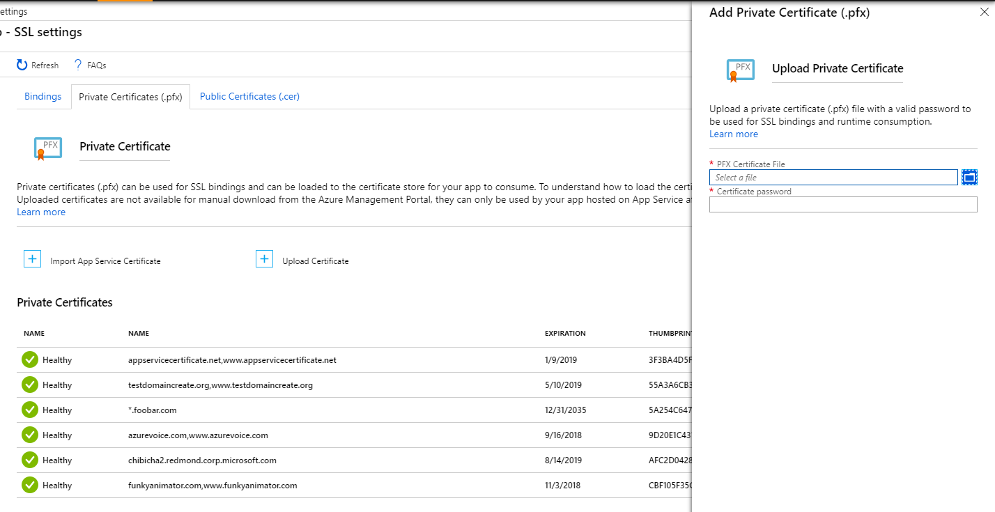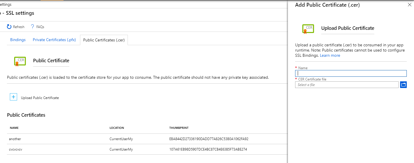 Public certificates can only be used by your app and they cannot be used for making SSL bindings. We are working out a way to move it to a place where it will make more sense. For now, SSL Setting is the place where Public certificates will reside. Private certificates require app settings to enable that feature (it's covered in this very old but reliable blog here) and now public certificates add another dimension to that feature by allowing you to upload (.cer) files and get the certificates in runtime.   Thanks for reading! I am writing this blog to showcase the changes we made to improve the overall certificate management experience for customers using App Service day in and day out. We are always open to feedback and looking forward to your comments. Feel free to reach out to us for any feature request or issues. App Service MSDN forum Feature Requests