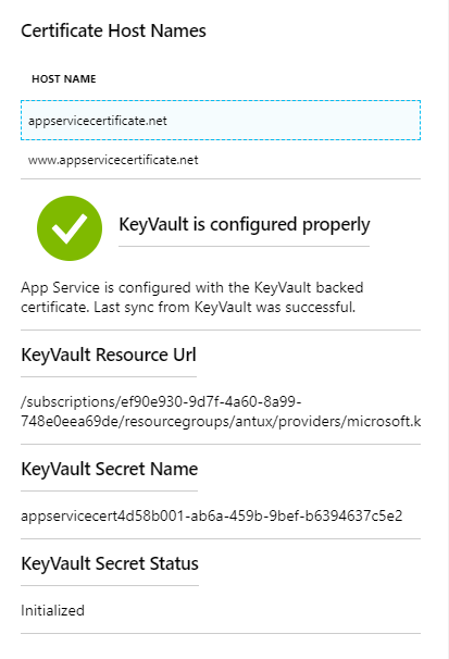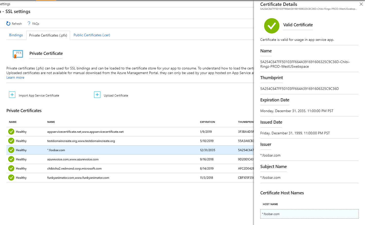 Private certificates used in App Service required a facelift to show the information we already gather when the certificate is uploaded, imported from App Service Certificate or imported from KeyVault. The driving reason was when we saw hundreds of private certificates configured on their app and had a tough time browsing through the certificates, the revamp allows the customer to now to get details of the certificates uploaded and imported. We added a new status column to the grid showing three possible states. Healthy, Warning and Expired. Warning being a certificate about to expire in the next 60 days. We also explicitly mention that you will need to upload a .pfx file to add a private certificate. [caption id="attachment_9355" align="aligncenter" width="1429"] Showing a test certificate that is valid.[/caption] We also show the KeyVault details and the sync status of the certificates pulled from KeyVault like certificates imported from App Service Certificate.