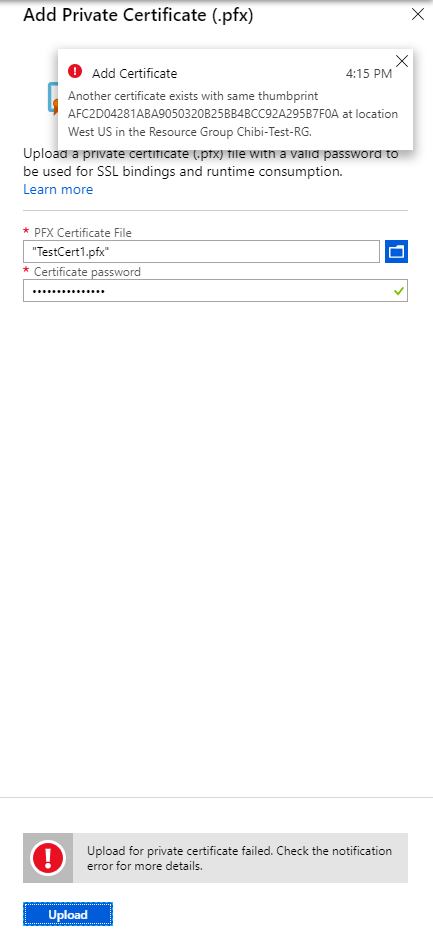 The Upload Certificate experience overall is more consistent in showing that private certificates only accept .pfx file and you need a valid pfx to add a private certificate to your App Service. Addressing another feedback, we stopped showing both upload path. Now upload certificates from the private certificates opens the UX where you can only upload the private certificates to avoid the confusion about uploading .cer or .pfx file. When the Upload certificate flow is opened from the public certificate tab we show only the public certificate option. We updated the upload certificate UX (and the underlying way it is implemented) to show errors while trying to upload a certificate without leaving the upload blade.