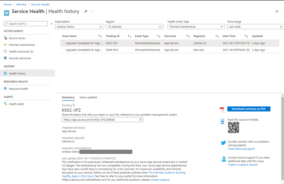From the Azure portal, go to Home > Monitor > Service Health > Planned maintenance. Here you can see all active (including upcoming or in-progress) notifications for the selected subscriptions. To make it easy to find App Service upgrade events, click the Service box, check all App Service types and uncheck everything else. To see past notifications, navigate to Health history and filter Planned maintenance from the Health Event Type box.