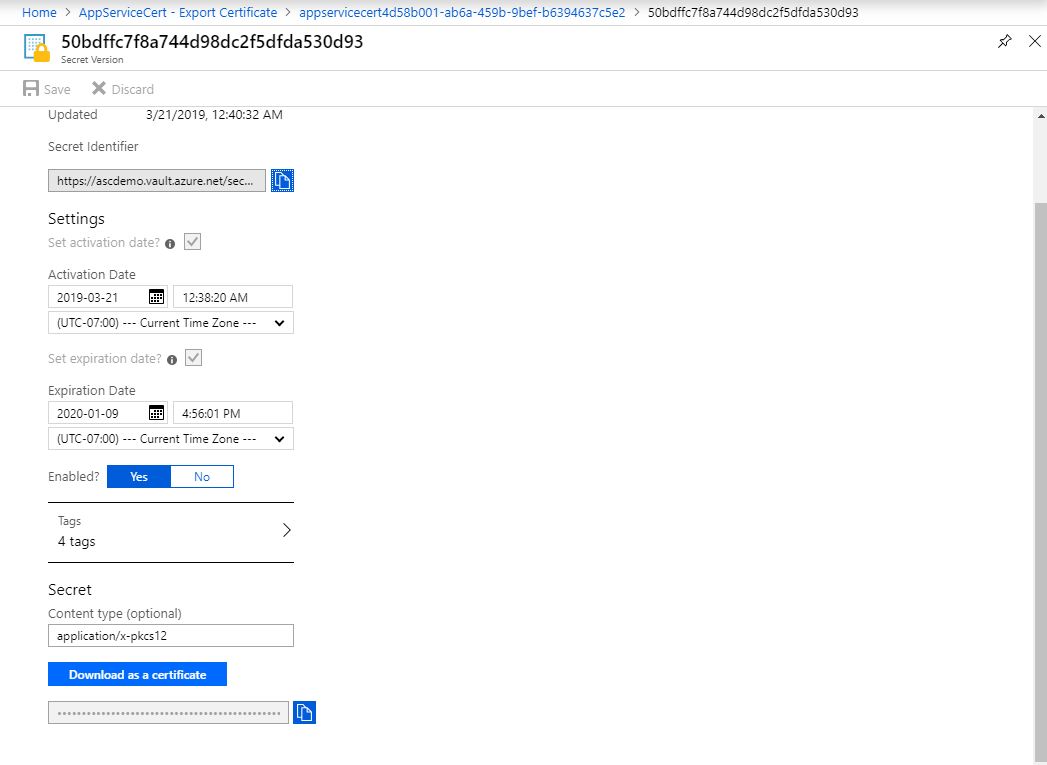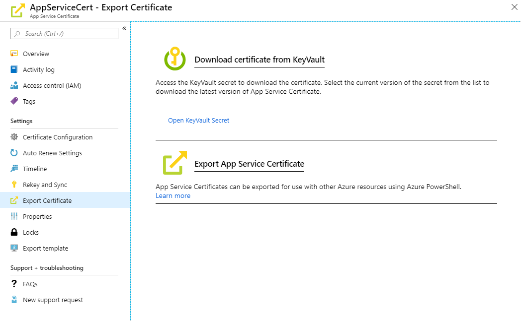 When you go to the export experience on App Service Certificate, you will see a new link to open the KeyVault Secret directly. In order to open the KeyVault secret you need to have GET permissions on the KeyVault Access Policy. Once you open the secret UI, you can navigate to the current version and download the certificate directly from the portal. The certificate will be in pfx format and may need further processing to add a password or prepare it for Linux/Mac usage. But for now, you do not need any PowerShell magic to get the pfx. Note that KeyVault secret UI does not add a password for the downloaded pfx. Once you downloaded the pfx, we advise you to install it on your Windows machine and export it with the password and delete the other occurrences to keep the pfx save (or as save as it can be now that it is out in the wild file system frontier). If you using mac or linux you will need to use openssl to secure it with a key.
